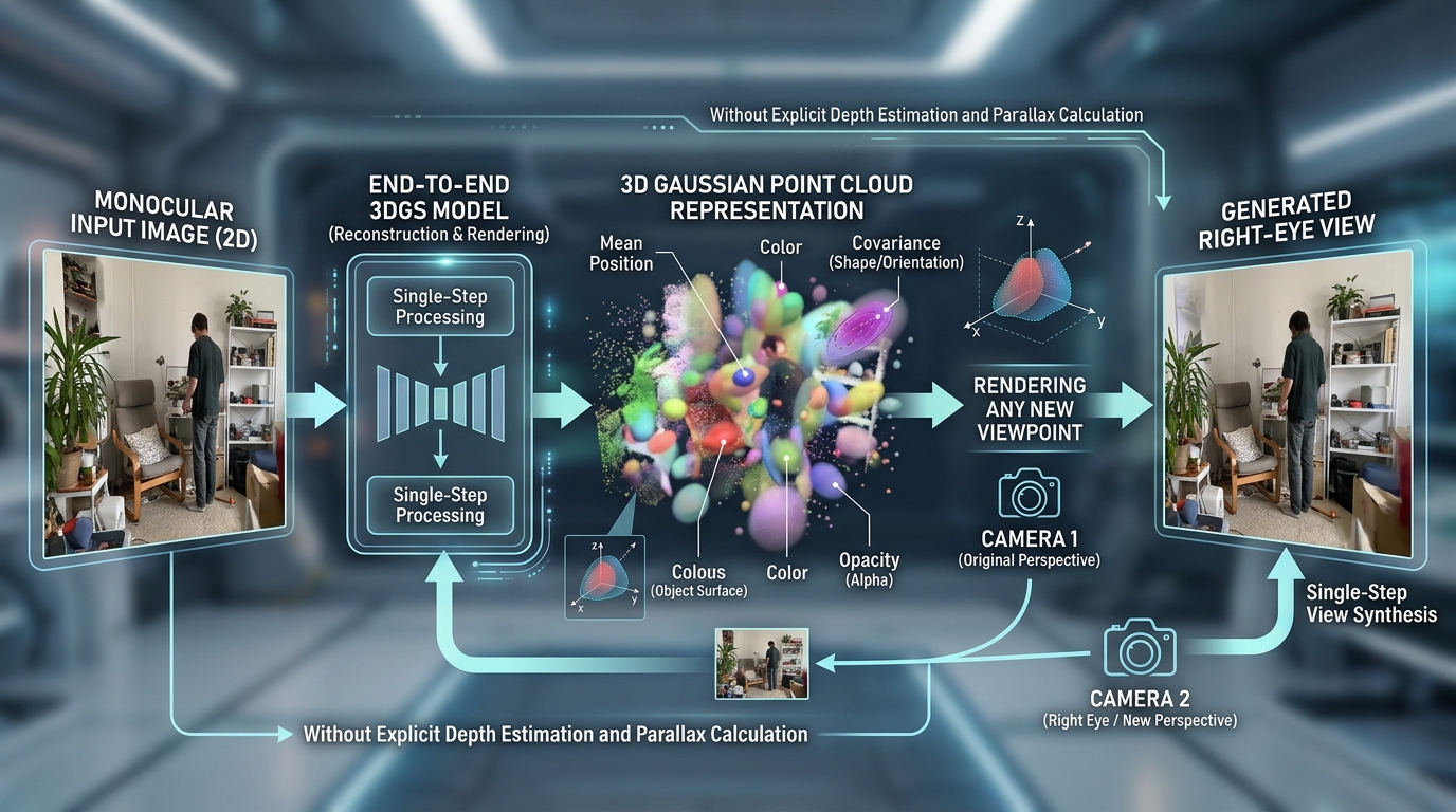 前言 在上一篇文章中,我们聊了基于深度估计的2D转3D方案——先估计深度,计算视差,预测另一视角,再填补空洞。这条路线流程清晰、可控性强,但也有明显的局限:深度估计本质是”猜测”,多阶段流水线的误差会逐级累积。今天我们来聊另一条技术路线:基于3...